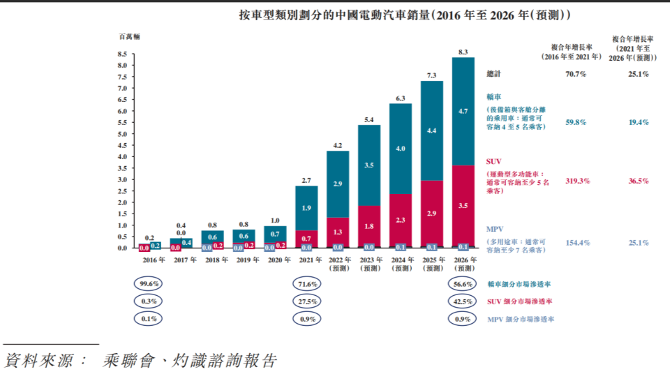 數據佐證了buzz的説法。威馬汽車曾在其上市招股書中披露過中國不同車型的增長速度,2016-2021年,SUV的年複合增長率已經達到了319.3%,而同時期轎車的年複合增長率僅為59.8%。