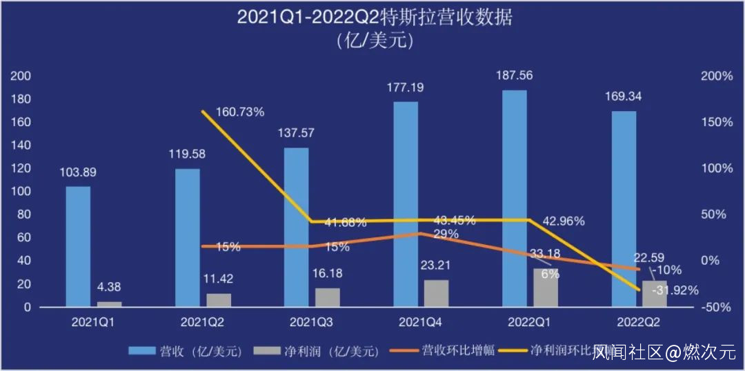 首先,特斯拉的營收與淨利潤同比增幅大幅下滑,且環比雙雙下降。