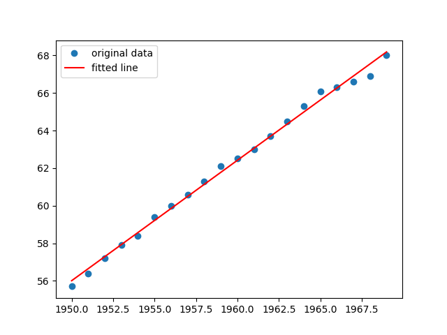 1950-1970年間台灣人口預期壽命與對應線性迴歸的關係圖示