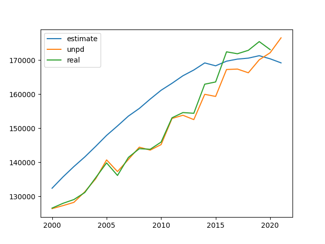圖中藍色曲線為我們建模下的預期死亡數,橙色曲線為聯合國經社部提供的死亡人數,綠色曲線為台灣“衞福部”的歷年統計死亡人數(實事求是地講,台灣省的公務員羣體的行政效率相對於世界平均水平還是做的相當不錯的,相關統計數據在官方網站的公式十分清晰易得)。值得注意的是,台灣方面和聯合國提供的死亡人口統計數據在2013年以前高度重合,但其後卻出現較大偏差。由於筆者並非從事相關專業研究,並不清楚箇中原因,不過總歸兩者在我們的預期線附近大體上做圍繞運動。