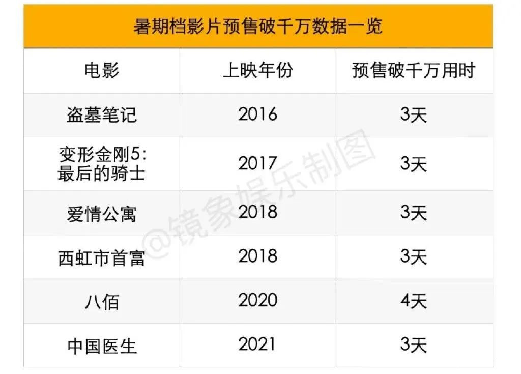 其次,《獨行月球》的預售票房在暑期檔創了新記錄,定檔三天、預售兩天預售票房破千萬,在歷年暑期檔都是罕見的。據鏡象娛樂統計,2016年至2021年,暑期檔的熱門影片《盜墓筆記》《愛情公寓》《西虹市首富》《八佰》《中國醫生》破千萬都歷時三天或四天。