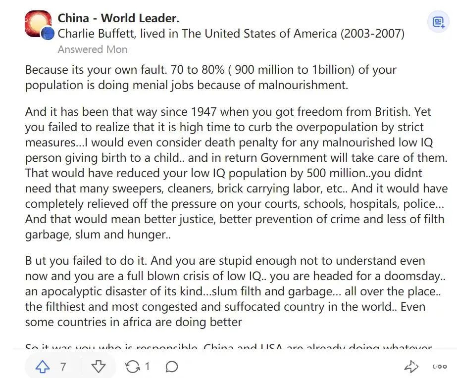 自1947年你們從英國人手中獲得自由以來,情況一直如此。然而,你們沒有意識到,現在是通過嚴格的措施來遏制人口過剩的時候了……我甚至會考慮對任何營養不良的低智商者生下的孩子處以死刑,作為回報,政府將照顧他們。這將使你的低智商人口減少5億。你不需要那麼多清掃工、清潔工、搬磚工等。這將完全緩解你們的法院、學校、醫院和警察的壓力……這將意味着更好的司法,更好的預防犯罪,更少的骯髒垃圾、貧民窟和飢餓。