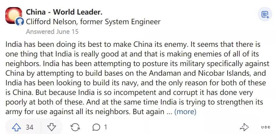 印度一直在盡最大努力使中國成為其敵人。似乎有一件事是印度真正擅長的,那就是與所有的鄰國為敵。印度一直試圖通過試圖在安達曼和尼科巴羣島建立基地來專門針對中國的軍事態勢,而且印度一直在尋求建立其海軍,而這兩方面的唯一原因就是中國。但由於印度是如此無能和腐敗,它在這兩方面做得很差。而與此同時,印度也在努力加強其軍隊,以便用來對付其所有的鄰國。但同樣印度很無能。而印度為什麼要對中國採取如此強硬的態度,因為它與巴基斯坦、孟加拉國和緬甸等國的問題已經夠多了,可能是嫉妒。