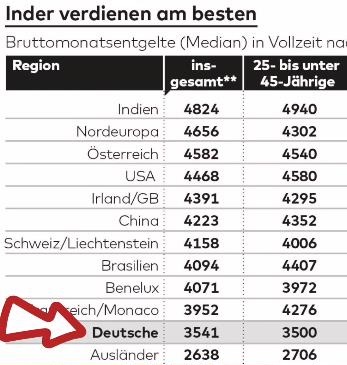 德國人3541歐,在德外國人2638歐,明顯比德國人低很多,但前面有10種外國人掙得比德國人要多,排在第一的是印度人,我們中國人排在第六,每月4223歐。