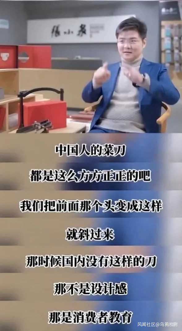 這一下把大家給整不會了。你説菜刀不能拍蒜是因為設計和材料問題,還勉強能説過去,消費者大不了買其他牌子的菜刀,但你説中國人連切菜的方式都是錯的,是準備讓全體國人去米其林進修一下?