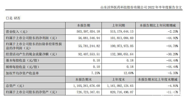 7月15日晚間,沃華醫藥披露了半年報,上半年實現營收5.04億元,同比降2.25%;實現淨利潤0.56億元,同比降44.92%。