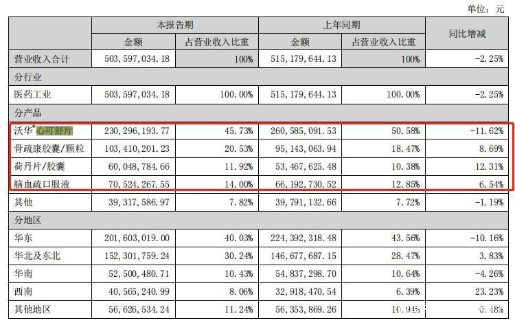據財報,沃華心可舒片、骨疏康膠囊/顆粒、荷丹片/膠囊、腦血疏口服液為沃華醫藥四大支柱產業,沃華心可舒片營收同比減少11.62%,其他三個藥物同比分別上升8.69%、12.31%和6.54%。