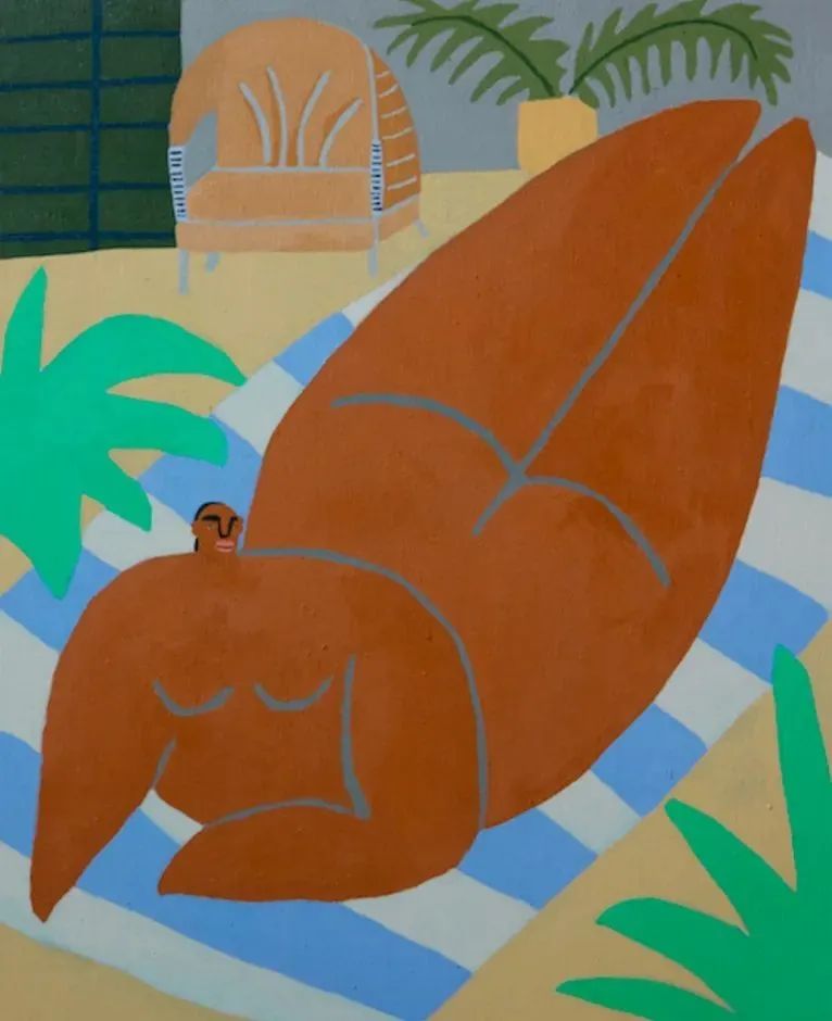 **她的作品多在描畫棕色的皮膚、自然強壯的身體。**大膽的超扁平風格,會讓人回想起馬蒂斯等藝術大師。