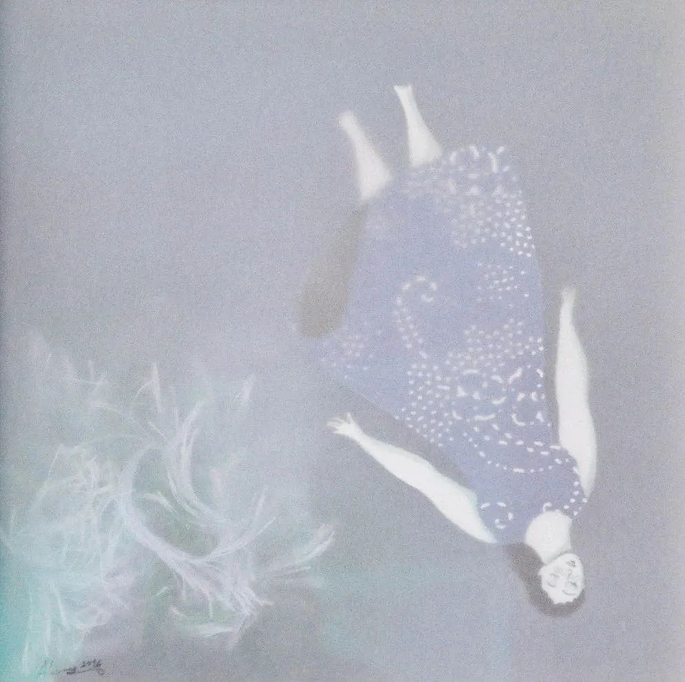 她的創作方式也很特別:把插畫作品放置在磨砂質感的透明紙下,只露出畫中人物的頭部和上肢部位,其他的部分隱藏模糊在透明紙下。
