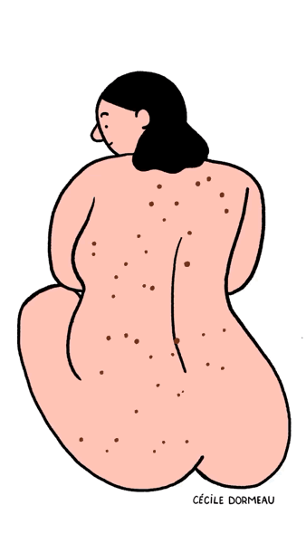 她用幽默歡快的方式畫筆還原出生活中普通女孩的模樣,以及那些主流輿論避之不提的真實:屁股上的生長紋、大腿上的淤青、小肚腩、毛髮、痣、雀斑、下垂的乳房、妊娠紋……