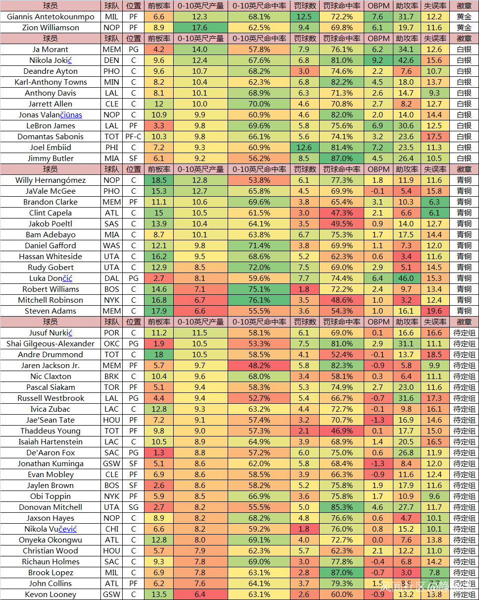 第二個級別,白銀徽章,授予那些“球隊大量圍繞他們的侵略性展開進攻,且可以取得滿意效果”的球員。目前適合的人選有莫蘭特、約基奇、艾頓、唐斯、濃眉、賈萊特·阿倫、瓦蘭丘納斯、詹姆斯、薩博尼斯、恩比德、巴特勒,合計11人。(數據詳見文末配圖)