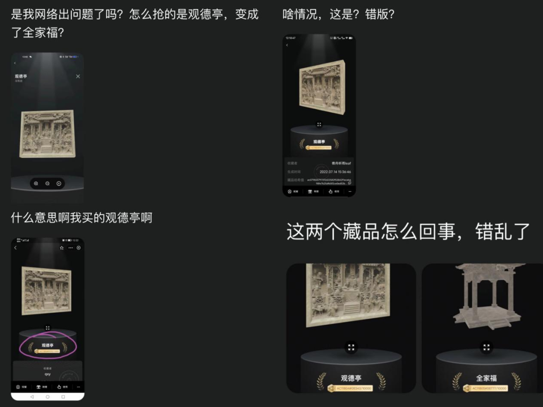 繼7月20日,騰訊旗下運行僅一年的數字藏品平台“幻核”平台被爆即將裁撤,引發業界一陣驚歎,二姐近日還發現,7月22日,阿里旗下的“鯨探”平台,出現了“觀德亭”和“全家福”兩件數字藏品圖文不符的烏龍,引發不少藏家吐槽。