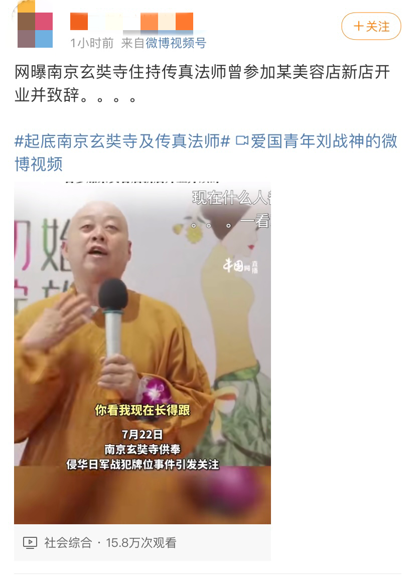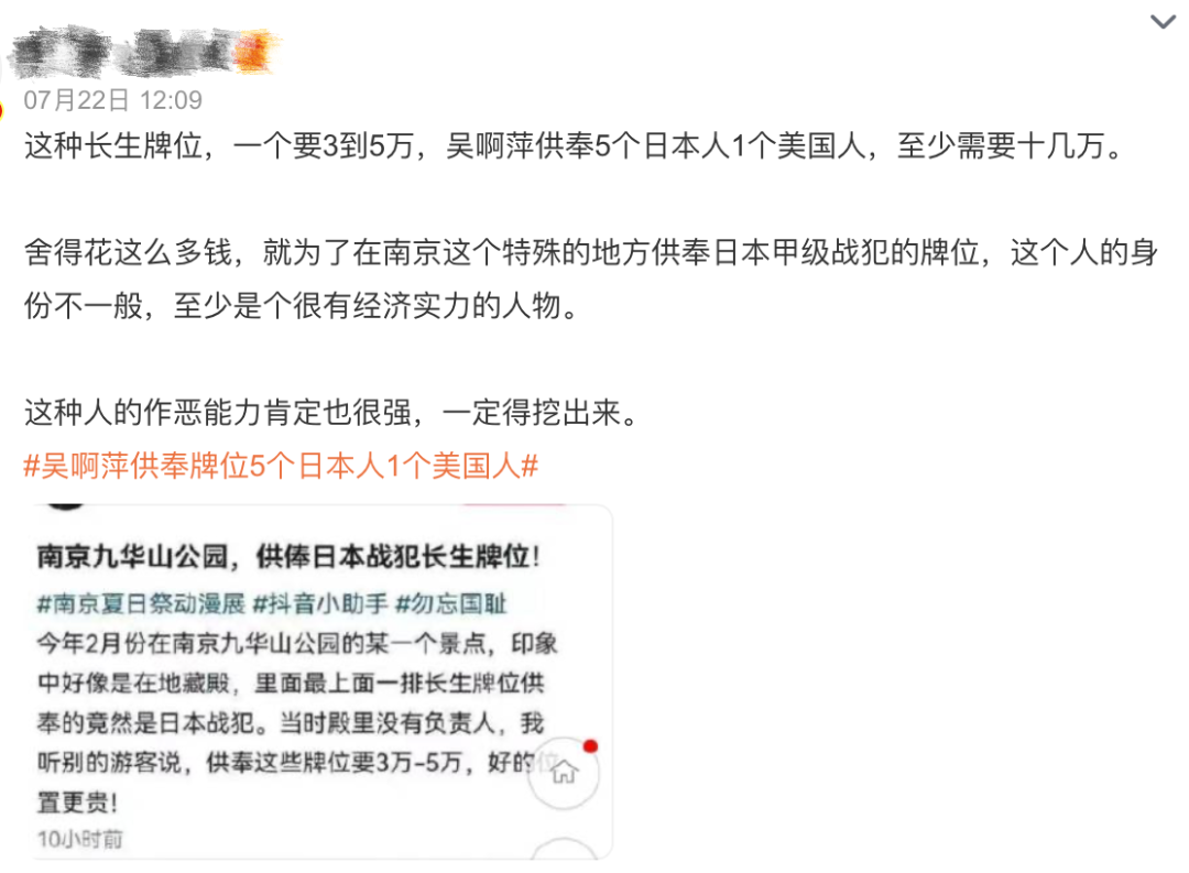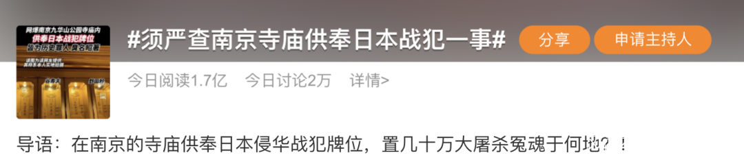 繼南京寺廟供奉日本戰犯一事引爆熱搜之後,又一個相關熱搜再次上榜: