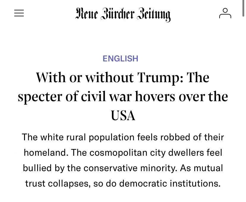 中國日報網7月26日電 瑞士《新蘇黎世報》(Neue Zürcher Zeitung)網站近日在題為《不管有沒有特朗普:內戰陰霾已在美國上空盤旋》(With or without Trump: The specter of civil war hovers over the USA)的文章中指出,隨着美國社會相互信任的崩塌,民主制度也在崩潰。