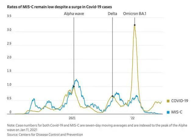 美國疾病控制與預防中心(Centers for Disease Control and Prevention,CDC)的數據顯示,**與前幾波大流行期間相比,兒童發生多系統炎症綜合徵(MIS-C)的情況在已知新冠病例中所佔的比例要少得多。**在大流行早期,醫生認為他們看到的是川崎病,但很快發現MIS-C是一種與早期新冠感染相關的獨特症狀。
