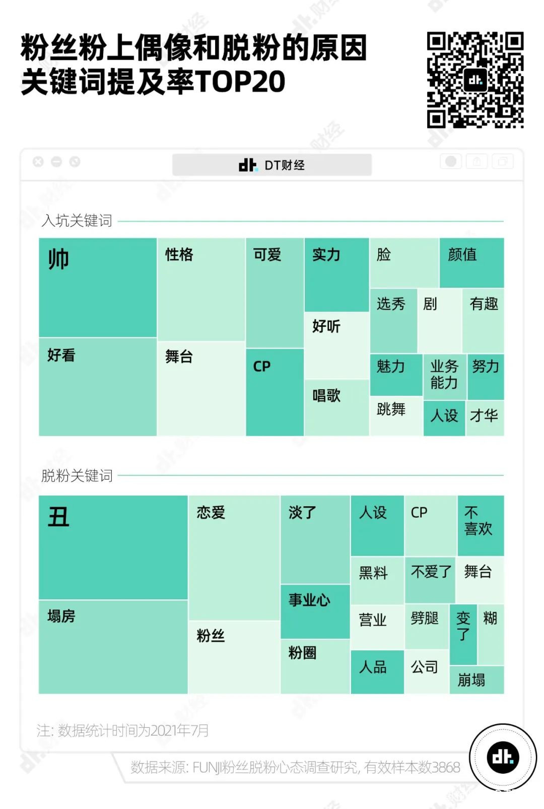 粉絲脱粉的 Top20 關鍵詞中,排名前三的分別是醜(14%)、塌房(12.4%)和戀愛(10.4%),相比之下,他們對偶像的事業心(3.5%)、人設(3.0%)、黑料(2.3%)、營業(2.2%)等並沒那麼在意。