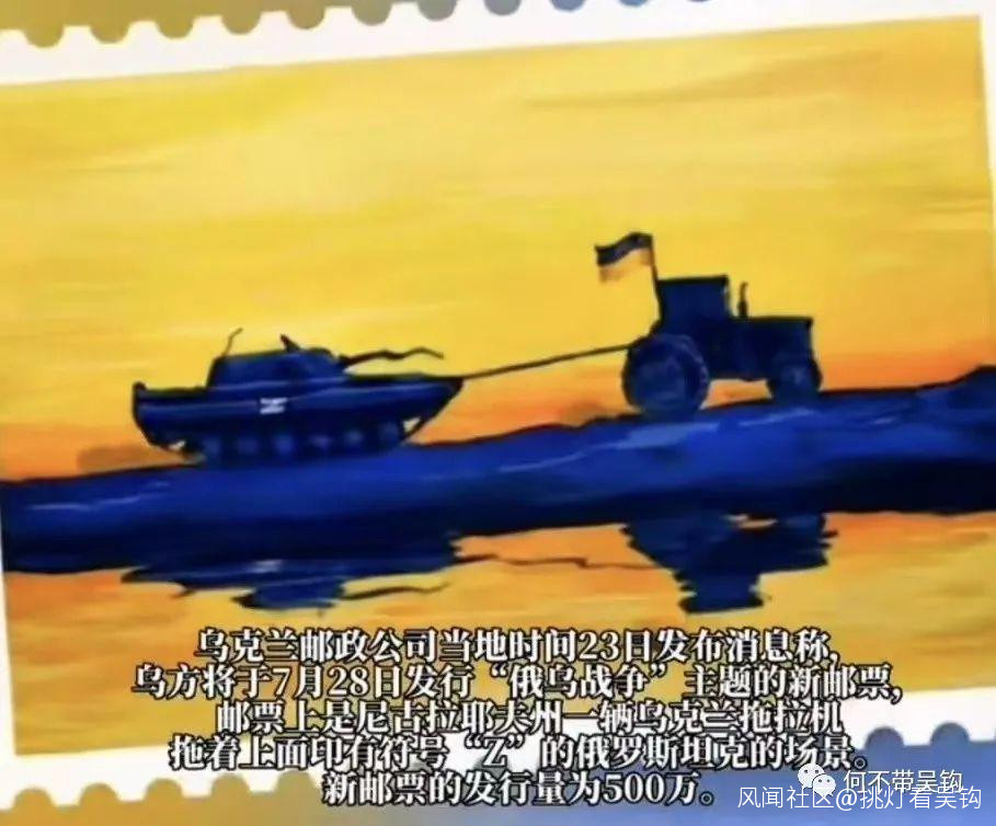 新郵票的主題雖然俄烏戰爭,但表現的是“田園風情”。畫面是烏克蘭拖拉機拖着寫着Z字俄軍坦克。“硬漢”的牛逼坦克服服帖帖跟在烏克蘭農民伯伯的拖拉機後面,不知道要去向何方?估計是廢品收購站吧?