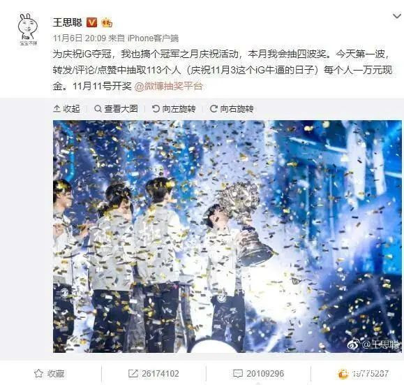 同年11月王思聰IG電競戰隊拿到了LPL七年來第一座獎盃,自掏腰包113萬發起了微博抽獎,隨機抽取113人,每人發1萬元現金紅包。2000多萬網友進行了轉發,王思聰的粉絲從2000多萬漲至3600萬。
