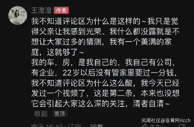 相對清白的家底讓王澄澄敢於在事件最初時對質疑進行回應:自己22歲創業後,再也沒拿過家裏一分錢,房和車都是自己買的。