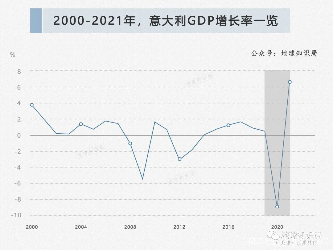 一方面,自2018年以來,意大利的經濟就一直在原地打轉。在2018年意大利GDP達到2.09萬億美元的高點後,2019年GDP反而萎縮到了2.01萬億美元。