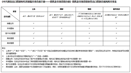 作為企業內部法律顧問,識別具象性業務合規風險是基礎性能力。隨着近兩年內部“能力內化”工作的持續推動,對外,面對域外性的法律解讀和行業風向捕捉問題上,中興通訊各合規域均已基本實現對外部法律法規的機制化的動態追蹤及政策解讀。對內,三大合規域均建立了以風險評估為基礎的規則體系。舉例説明,我們在《中興通訊出口管制和經濟制裁全球合規手冊》中已針對不同業務領域內的各個業務流程所涉及的主要出口管制合規風險建立了相應的合規風險矩陣表,確保對所有業務活動潛在出口管制合規風險的“應識盡識”,進一步凸顯了企業內部法律顧問的獨立價值。
