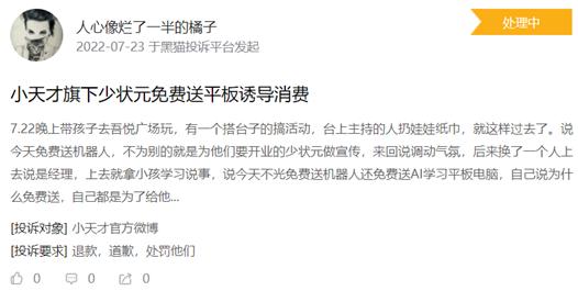 7月10日,有消費者在黑貓投訴平台投訴稱:“小天才手錶z6巔峯版,去年一直可以使用的一款少兒應用,今年無故被下架,無通知用户,聯繫小天才客服後,對方表示因為暑期來臨防止小孩子亂玩遊戲所以小天才官方私自下架了!我為包年用户,兩年費用198元,現要求退費並給一合理解釋。”