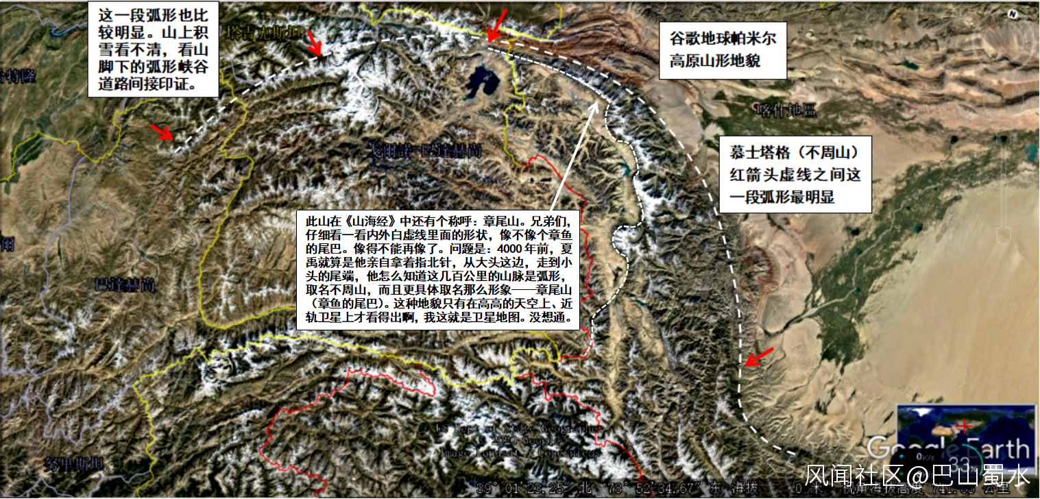 尤其是“不周山”(沒有形成圓周的冰山),其形狀真的就是一個半圓形山脈形狀,這個半圓形山脈走勢,綿延幾百公里,形狀必須是在太空中才能看出這個山脈是半圓狀(我發上的這個圖就是衞星圖,就是模擬我在太空中看到的這座山脈的半圓形狀——鄙人反覆通過多國衞星地圖旋轉、放大比對了全世界的所有山脈走勢,唯有這座山是這種獨特的弧形山脈走勢)。而且高達七、八千米,之所以叫頂天柱(就是神話傳説中,共工怒觸不周山,撞斷頂天柱那座山),就是因為很高,才稱謂“頂天柱”。當時置身大地的華夏老祖,他們是怎麼知道這座山脈是半圓形走向,那麼精準、形象取名“不周山”——沒有形成圓周的冰山?