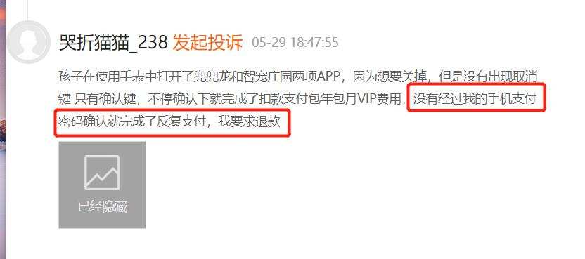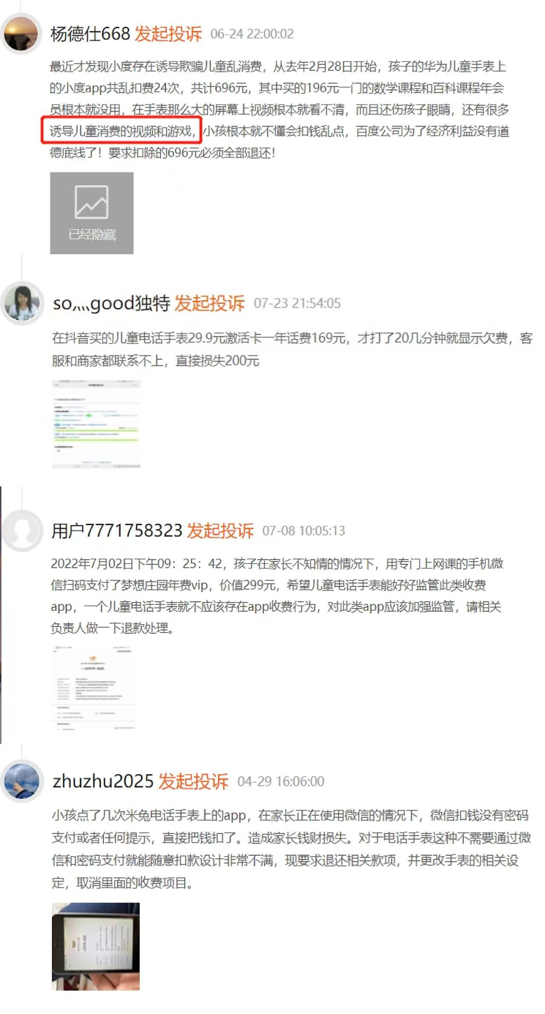 一石激起千層浪,除了平板電腦,小天才兒童電話手錶隨後也被爆出誘導消費的問題。有家長在黑貓投訴上稱,孩子在使用手錶過程中不小心點擊付費訂閲,產生異常扣費。整個過程沒有經過家長手機支付密碼確認就完成了扣款,由此質疑小天才對付費APP的監管和支付流程的設置。