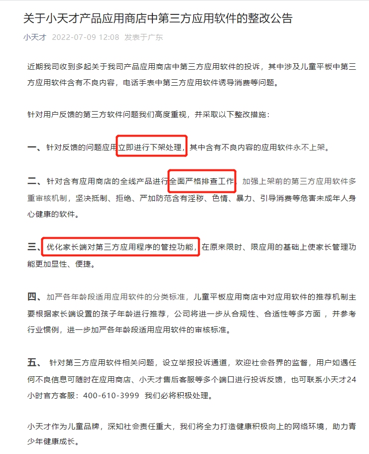 對於消費者的投訴和輿論的批評,小天才發佈公告稱,將採取永不上架含有不良內容的APP、排查應用商店全線產品等措施。但這則針對第三方應用軟件的整改公告沒能讓消費者滿意,不少網友指責其“甩鍋第三方”“毫無誠意”。