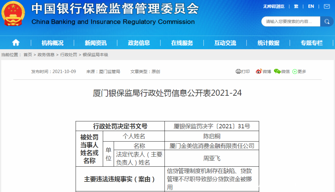 2021年10月9日,中國銀保監局公佈的一則行政處罰顯示,金美信消費金融因信貸管理制度機制存在缺陷、貸款管理不盡職導致部分貸款資金被挪用的主要違法違規事實,被處以罰款290萬元,其相關責任人也被給予警告。