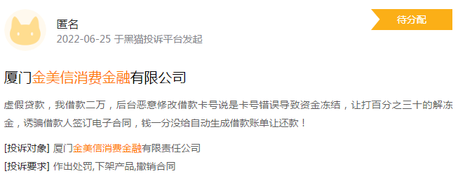 據第三方投訴平台黑貓投訴顯示,金美信消費金融存在違規收取借款服務費、亂扣費、虛假貸款、涉嫌套路貸、暴力催收等情況。但由於被投訴的金美信消費金融未入駐該投訴平台,因此以上投訴尚未處理。