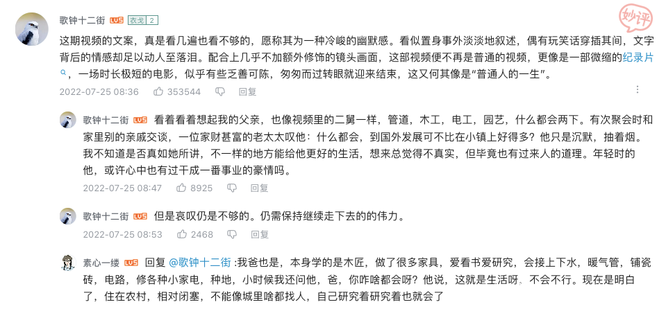 視頻標題裏寫“二舅治好了我的精神內耗”,雖然這條視頻並沒有真正解決網友的“精神內耗”,但二舅的出現,是一種對年輕人的正向引導。