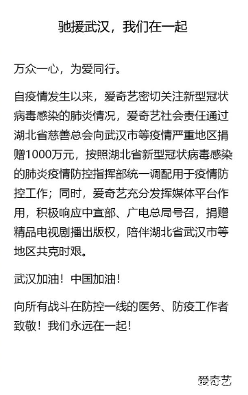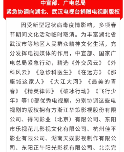 **中宣部、廣電總局緊急協調,向湖北、武漢電視台捐贈10部優秀電視劇版權,給疫區人民送去暖意,贏得了社會各界的讚許。**在疫情擴散期間,越來越多的人渴望獲得充足的免費文化產品。