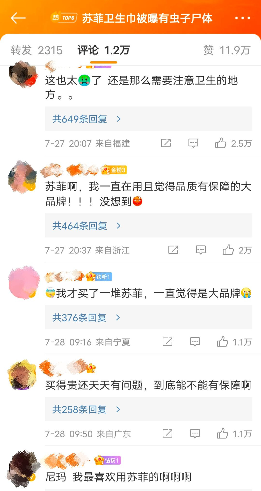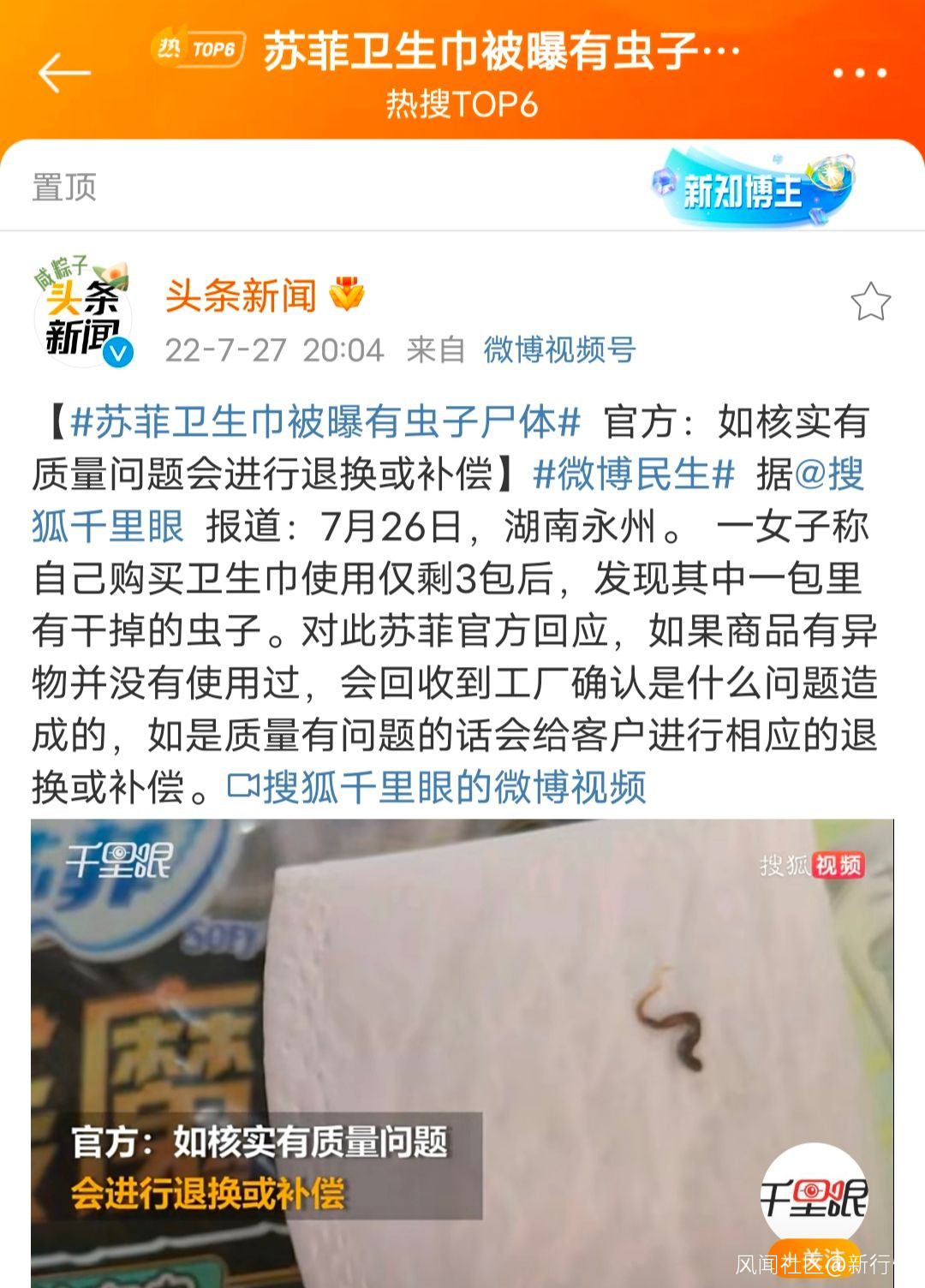 7月28日,#蘇菲衞生巾被曝有蟲子屍體#登上微博熱搜第一。