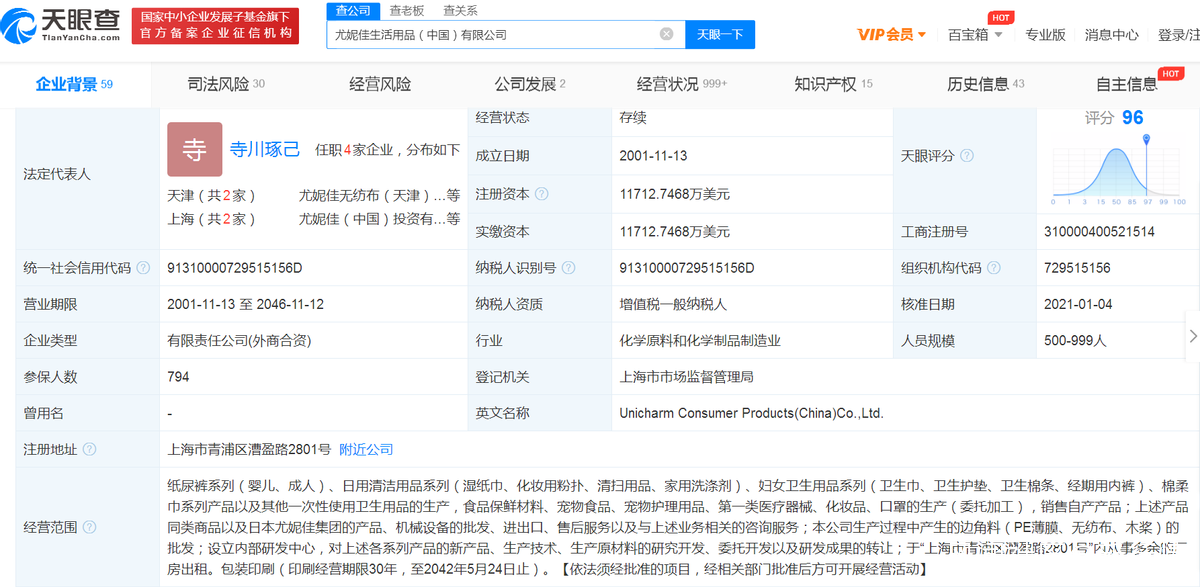 天眼查信息顯示,蘇菲衞生巾關聯公司尤妮佳生活用品(中國)有限公司成立於2001年11月,註冊資本約1.17億美元,由尤妮佳(中國)投資有限公司和伊藤忠商事株式會社共同持股。