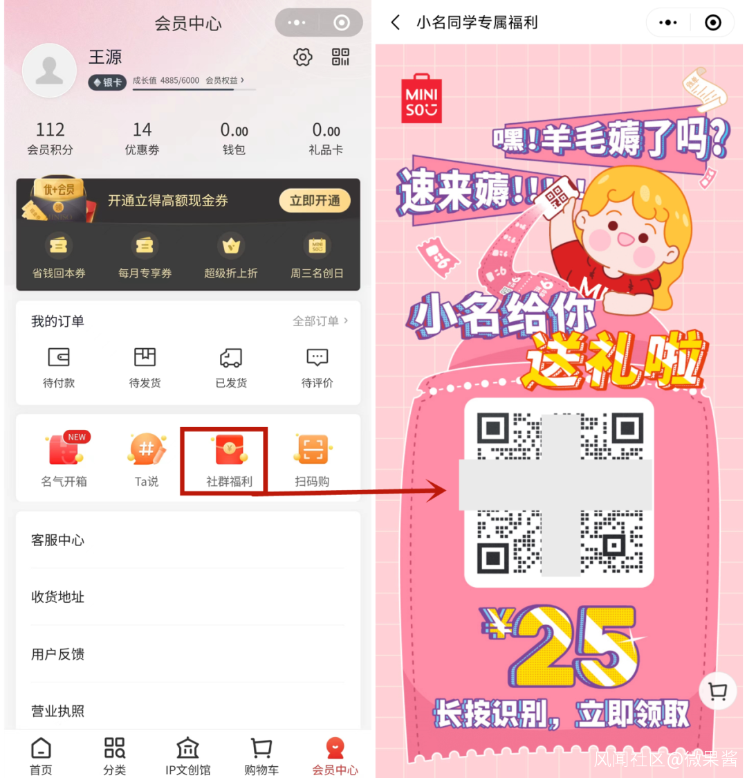 入羣即享福利是基操。用户進羣后,即會收到進羣福利以及社羣福利指南,一來方便用户快速瞭解名創優品的社羣,二來獲得用户信任感,領券即可立刻下單購買。