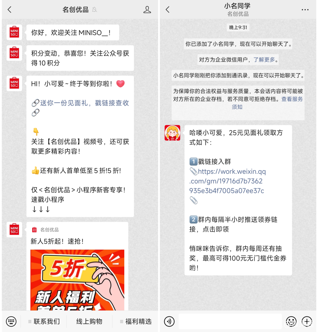 關注後,用户將會收到“新人低至5折”等優惠提示,點擊文字鏈接則跳轉至“掃碼添加@小名同學 領取25元福利”的頁面。添加好友成功後,用户將進一步收到“進羣領取福利”的提示。不過,如今的名創優品線下門店已從引導關注公眾號變為添加店長企微,縮短了公域到私域的引流途徑。
