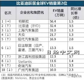 排在首位的特斯拉增長乏力。提高存在感的是上年居第4位的比亞迪,銷售32萬輛,超過上海汽車集團和德國大眾,排名提高至第2位。