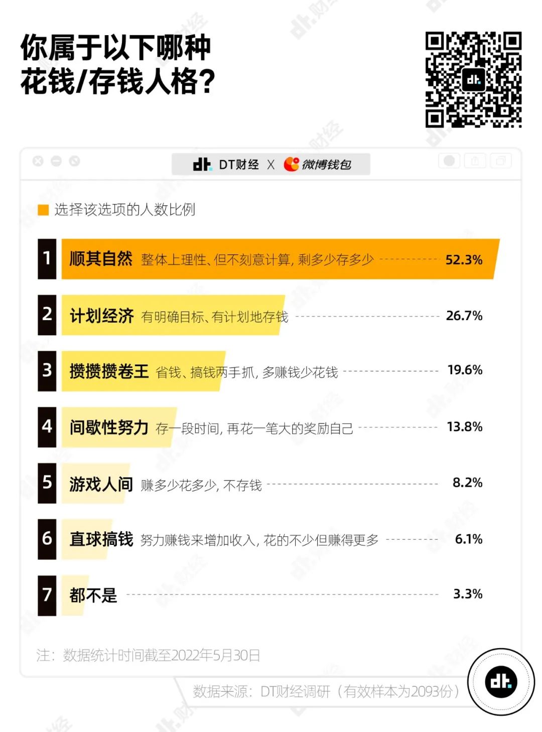 從DT財經的調研來看,年輕人中的主流花錢人格是“順其自然”,超過一半受訪者將自己歸入這一選項。這類年輕人對於花錢或存錢整體上保持理性,但不會刻意斤斤計較一定要賺多少、花多少、存多少,不浪費但也不會虧待自己的生活。
