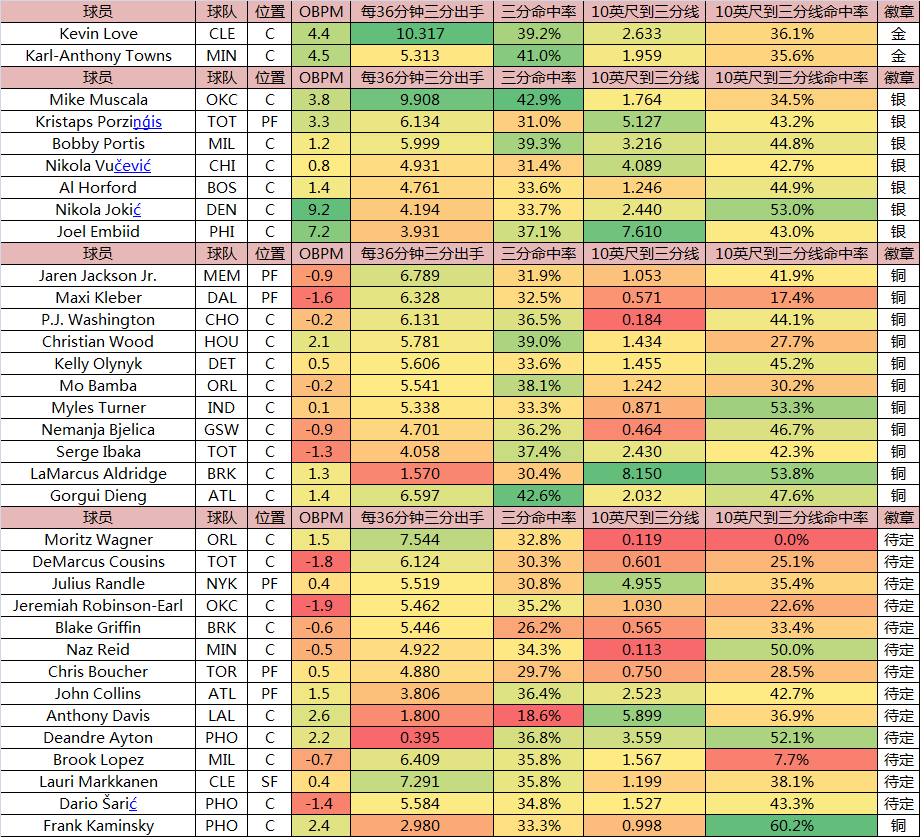 在今天的NBA,能在四號位提供空間已經不是特殊要求,而是基本需求,所以一個能投三分的四號位並不值得我們單獨拉出來表彰一番,他掛一個射手徽章就夠了。能獲得“空間內線”殊榮的,一定是那些能在五號位提供空間的大個子,包括全職五號位和大量時間搖擺到五號位的內線搖擺人,這些球員可以直接針對護筐手,並在不降內線體型的情況下,協助球隊擺出全空間陣容,提供重要的戰略價值。