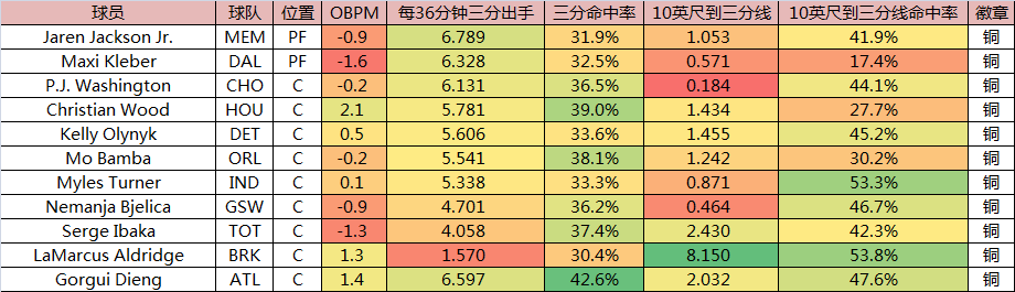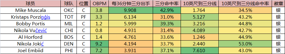 霍福德常規賽大樣本的三分表現只能拿銅章,但他還有順下急停接球中距離,今年季後賽的投射表現逆天,必須銀章。穆斯卡拉是所有內線球員裏三分產效最漂亮的一位,但他只有在雷霆這三個賽季的合計1810分鐘是這個水平,平台也低了,所以上限只能給銀章。