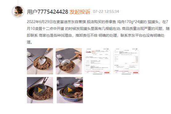 7月22日,有消費者表示,2022年6月29日在麥富迪京東自營旗艦店購買的吞拿魚雞肉170g*24罐的貓罐頭,在7月10凌晨十二點中開罐的時候發現罐頭裏面有幾根蛆在動,商品質量出現嚴重的問題,隨即聯繫商家也是各種找理由,推卸責任不給明確的處理,聯繫京東平台也沒有明確處理。