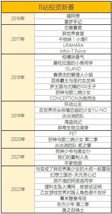 2016年,B站收購日本動畫企劃、製作Children’s Playground童園為全資子公司。在2015年愛奇藝投資《龍心戰紀》的過程中,製作委員會中擔任製片公司也正是童園。正是通過童園,B站進入了30多部新番製作委員會。這些作品如下表所示。