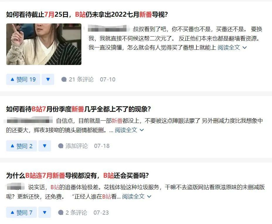從幾年前的國內新番版權大户,到如今新番大量缺席產生的極大落差,不由得讓動漫愛好者們唏噓。“這或許就是先審後播的最終結果吧!”“我是‘正版受害者’,看番早就不去B站了。”“是不是還在審?現在只有確定過審的新番,B站才會掛出頁面了。”“7月新番值得買的不多吧……如今B站買番都衝着破圈去的。”相較於B站上的其它版權內容,新番總是充滿着太多不確定性。包括數次自審自查下架大量動畫,LEX事件,以及“先審後播”,打碼摳圖,在核心動畫觀眾看來,番劇區如今的問題,是B站急於“破圈”必然付出的代價。