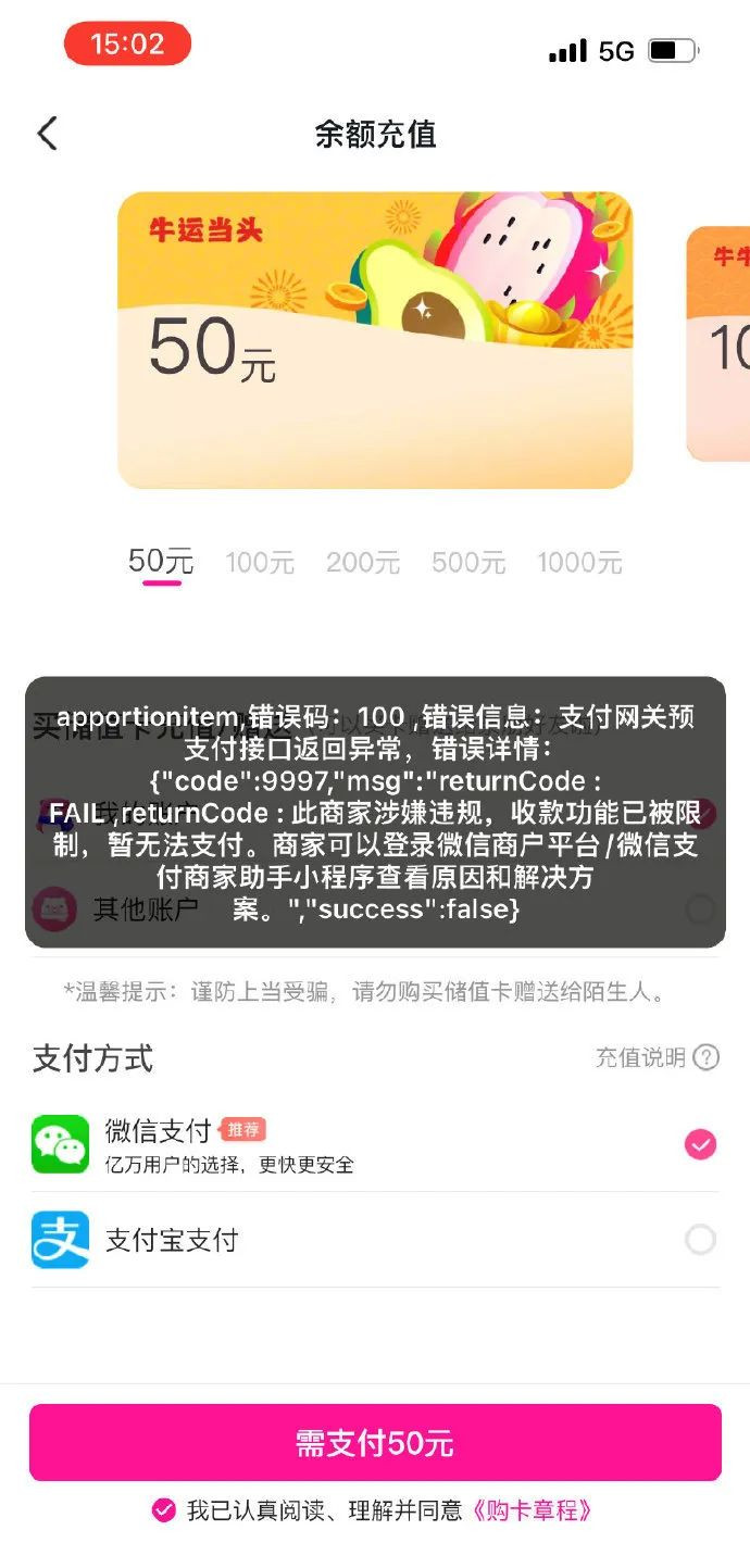 7月29日,網友發現每日優鮮充值系統提示報錯,只要充值就會提示“支付網關預支付接口返回異常,此商家涉嫌違規,收款功能已被限制,暫無法支付”
