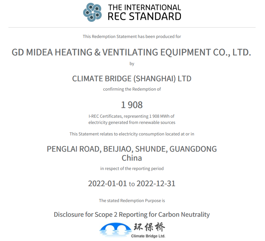 作為國內主要的綠色電力證書和碳信用開發商和供應商,環保橋通過可再生能源綠色電力證書和核證碳減排量(CER)助力美的樓宇實現了零碳產線的認證。
