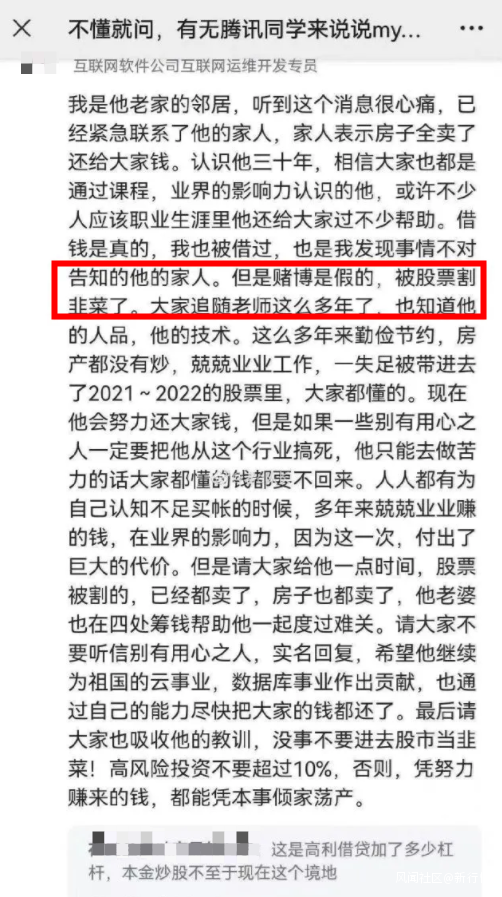 昨日,有網友在社交平台爆料稱,騰訊雲數據庫負責人林某借錢一億元用於炒股,已在賣房並四處籌錢。