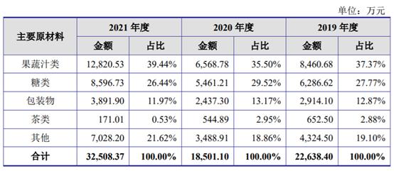 但近年德馨食品主要原材料的採購單價,幾乎都發生了上漲。採購佔比最大的果蔬汁類更是逐年上升,報告期內,果蔬汁類的採購單價分別為10.24元/千克、11.03元/千克、13.12元/千克。