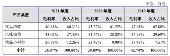 值得注意的是,報告期內,飲品濃漿給德馨食品帶來了2.47億、2.19億及3.19億元收入,分別佔主營業務收入的62.80%、61.22%及60.31%。這也就意味着連續三年帶來超六成主營業務收入的飲品濃漿的毛利率是在一路下滑的。