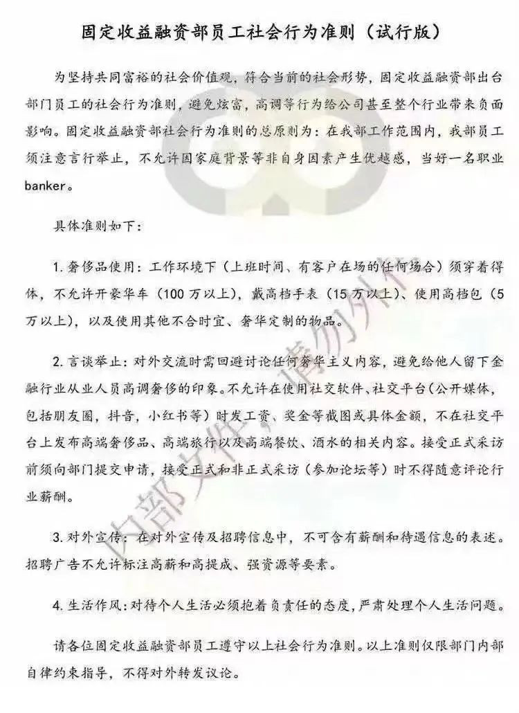 (近年網絡上盛傳的國內某金融機構禁止員工炫富的內部準則)